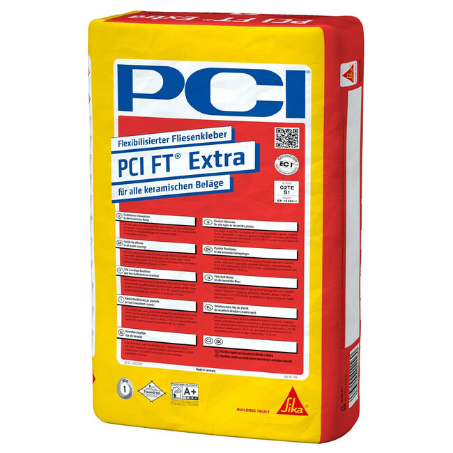 De PCI FT Extra is een multi inzetbare tegellijm en is geschikt voor alle keramiek. De tegellijm heeft een extra grote kleefkracht. De lijm is met een S1 label gecertificeerd. Hierdoor is de tegellijm zeer geschikt bij het gebruik van vloerverwarming. De lijm kan perfect spanningen en warmte schommelingen opvangen. De aangebrachte tegels hechten direct, maar kunnen toch eenvoudig worden gecorrigeerd. De lijm laat zich zeer makkelijk verwerken en kan al na 8 uur worden afgevoegd. Dit levert enorme tijdwinsten op. Het lage verbruik maakt dit product voordelig in gebruik.
