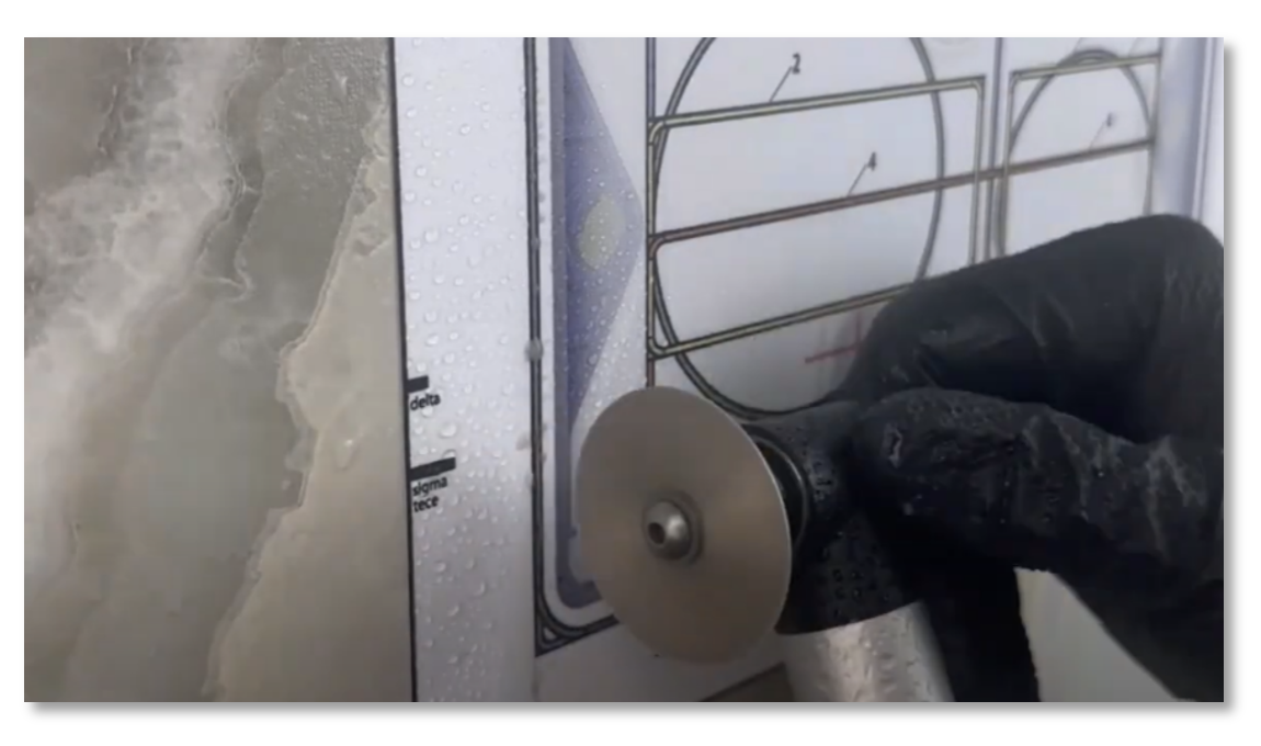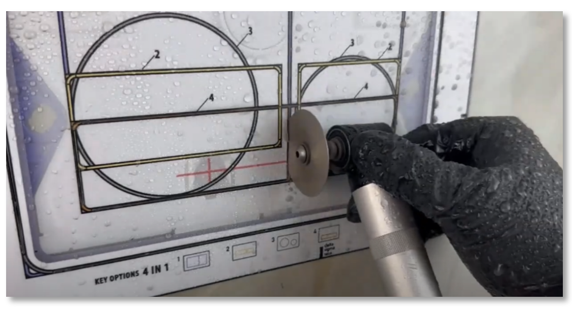 | Zaag de hoeken niet direct volledig door, zodat de uitsnede nog blijft "hangen" in de tegel. Zo behoud je meer controle tijdens het zagen. Als je helemaal rond bent gegaan, kun je de sticker verwijderen en de lange zijden doorslijpen met de haakse slijper. Blijf ook hierbij water gebruiken voor het beste en strakste resultaat. |