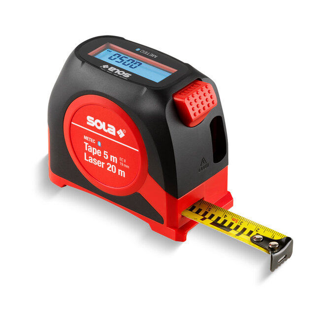 De SOLA METEC combineert een digitale rolbandmaat (5 m) met een laserafstandsmeter (0,05-20 m) in één tool. Je leest metingen af op het verlichte display en kunt ze via Bluetooth doorzetten naar de Sola App Lees meer.
